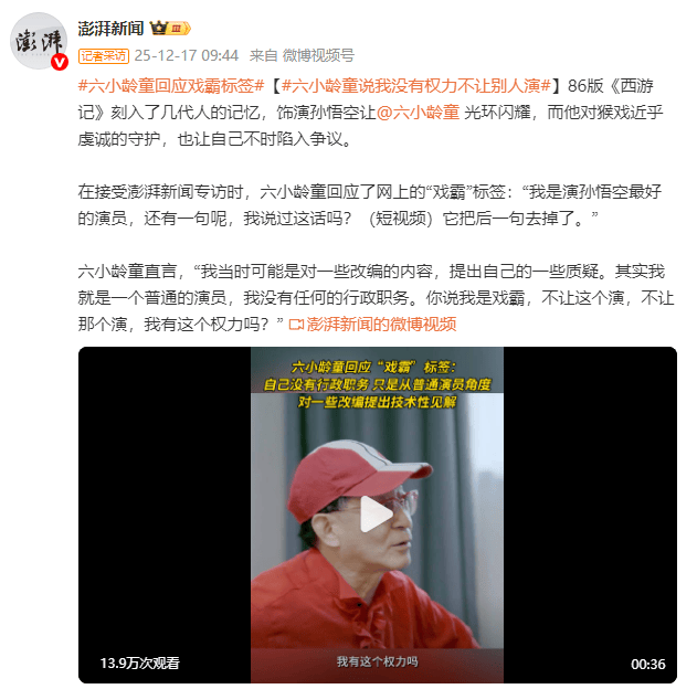 在接受澎湃新闻专访时,六小龄童回应了网上的“戏霸”标签:“我是演孙悟空最好的演员,还有一句呢,我说过这话吗?(短视频)它把后一句去掉了。”